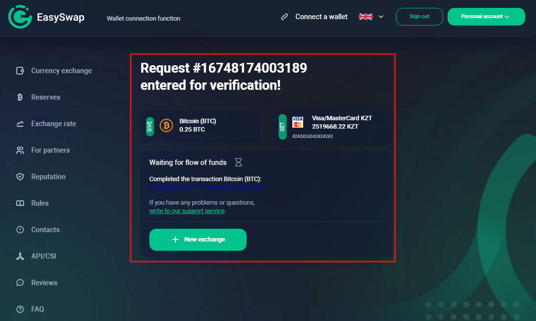 Click "Start exchange", which will mean your agreement with the exchange rules. Please familiarize yourself with them in advance;